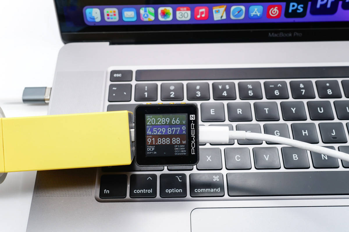 קודם כל, בואו נסתכל על טעינה מהירה. השתמש במטען של 100W עם מתאם מגנטי בעל ראש ישר כדי לטעון את המחשב הנייד בהספק של 20.12V 2.86A 57.54W.