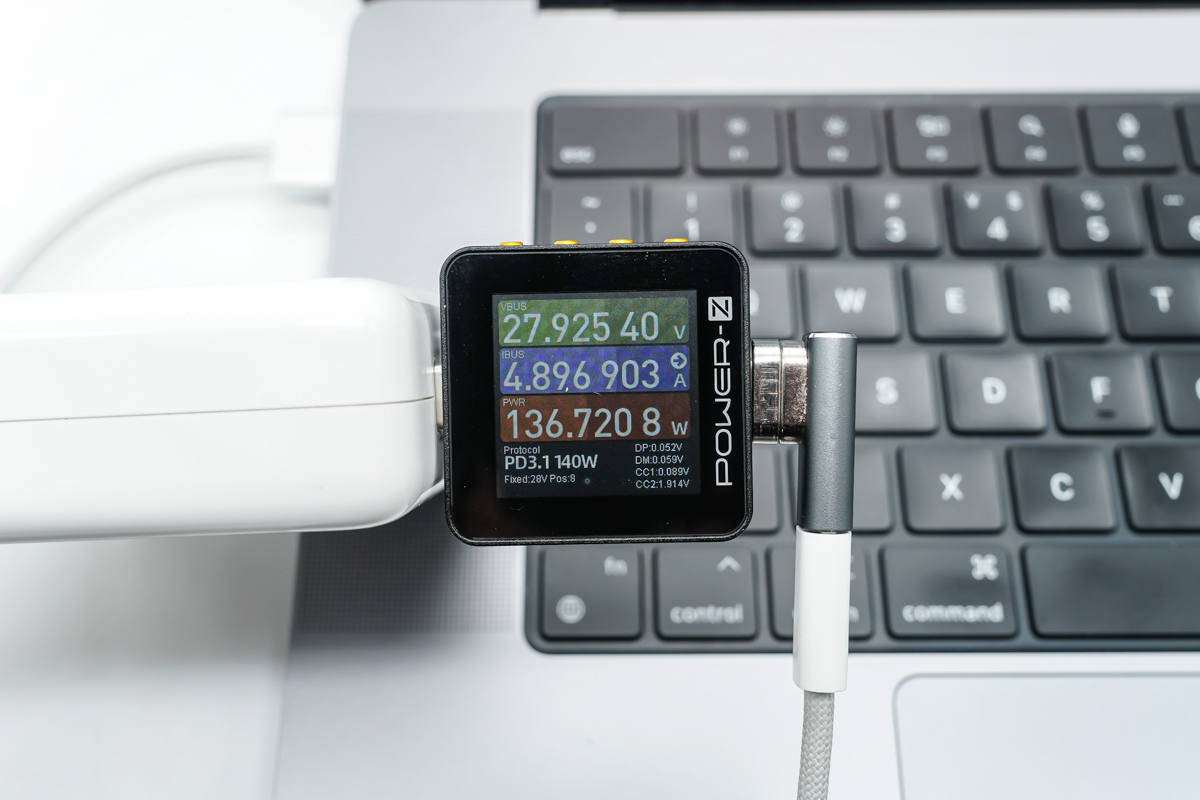 אפילו... הוא תומך גם בטעינה מהירה של 140W, והמתאם מחובר למטען גליום ניטריד 140W של אפל ולכבל הטעינה המהירה של MagSafe 3. בשלב זה, מתח הטעינה הוא 28V והספק הוא 135.72W.