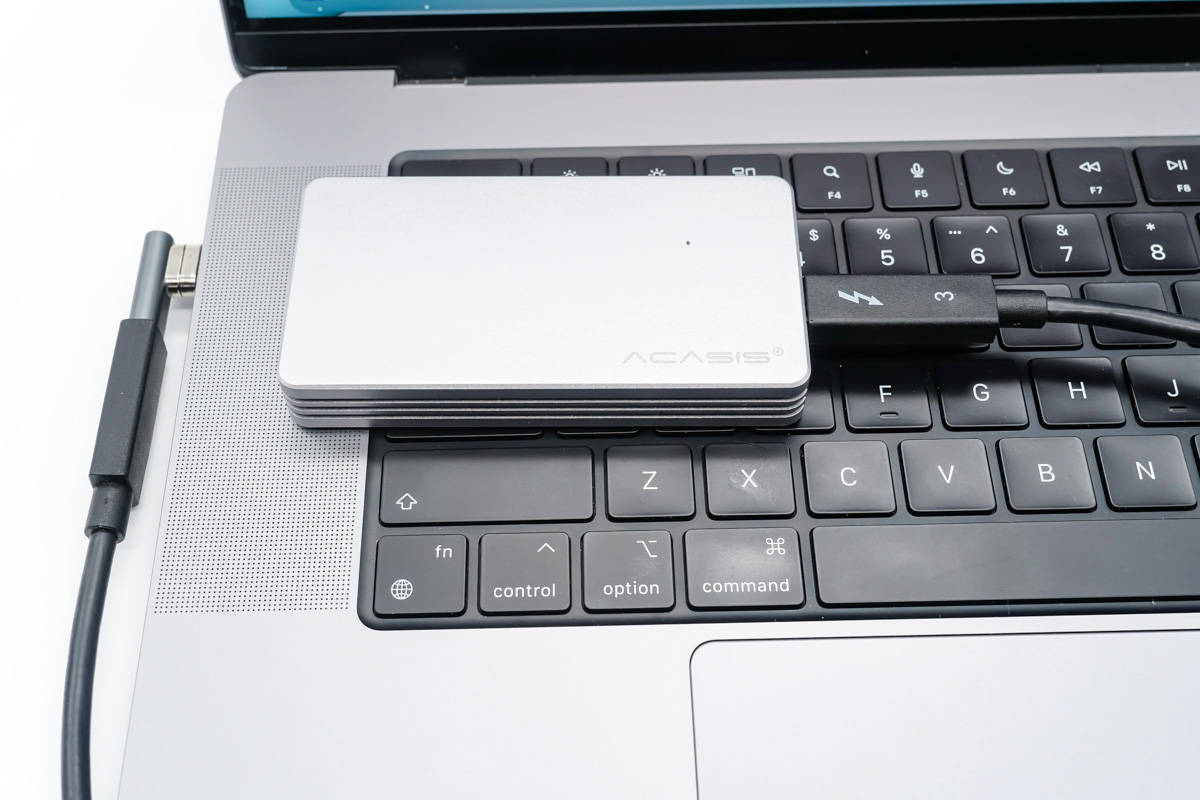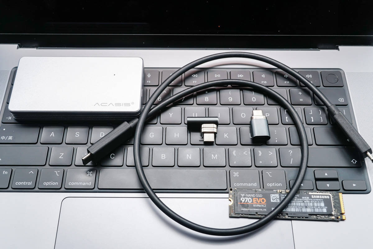 לאחר מכן, בואו נסתכל על מבחן העברת הנתונים. הכלים שבהם נעשה שימוש הם כונן מוצק של Samsung 970 EVO, תיבת דיסק קשיח Thunderbolt 3, כבל נתונים Thunderbolt 3 ושני מתאמים.