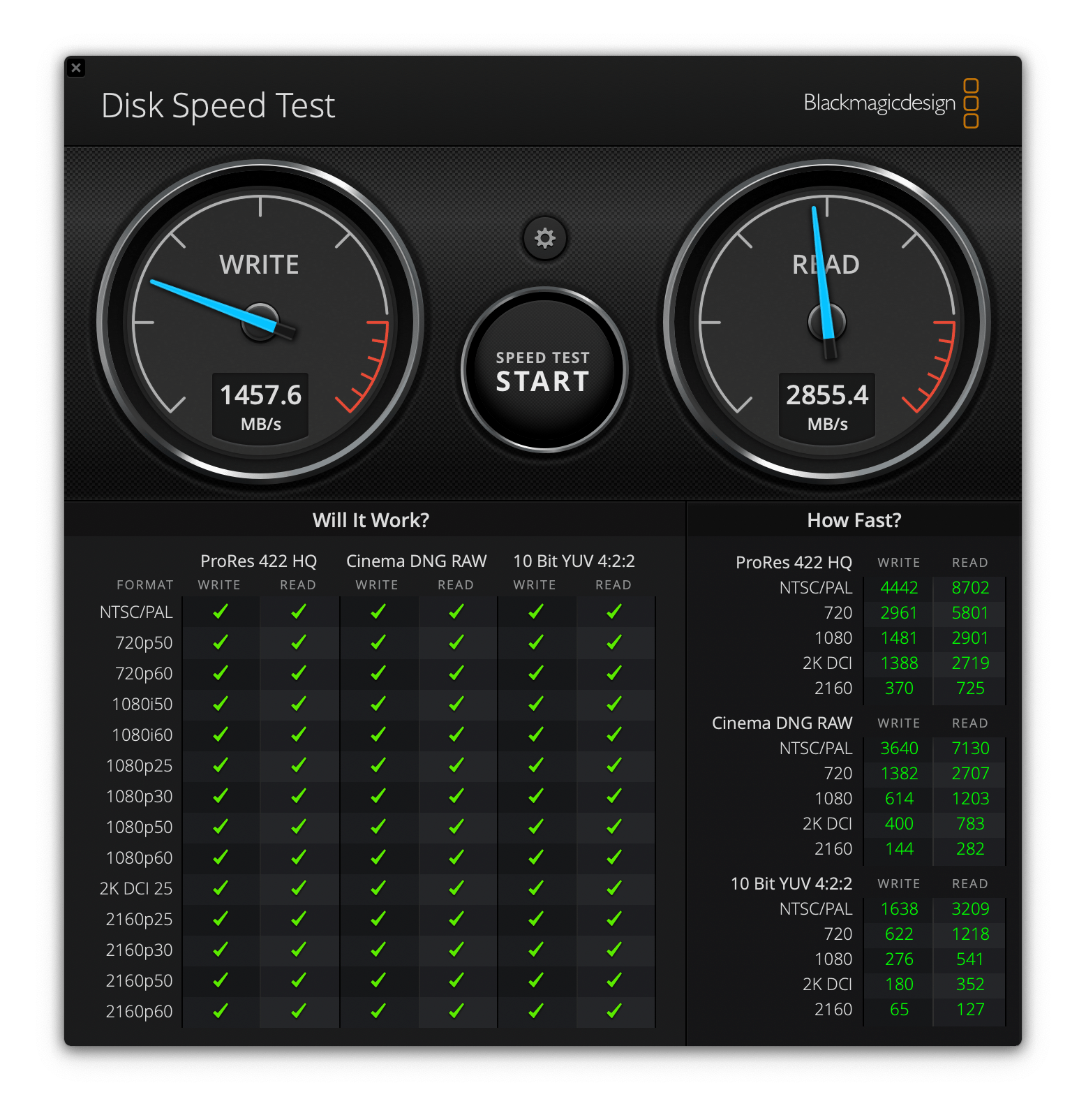 שימוש במבחן מהירות הדיסק ב-MacBook Pro כדי לבדוק את מהירות ההעברה, מהירות הכתיבה הנמדדת היא 1457.6MB/s ומהירות הקריאה היא 2855.4MB/s. (מהירות הכתיבה בפועל של הכונן הקשיח של Samsung X5 כאן היא 1700MB/s ומהירות הקריאה היא 2400MB/s)