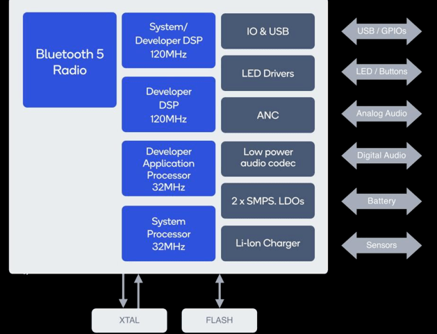 מערכת-על-שבב (SoC) של קוואלקום QCC5124 מתוכננת לענות על הצרכים של התקנים קטנים לחוויית האזנה חזקה, איכותית ואלחוטית עם צריכת חשמל נמוכה להפעלת שמע ארוכה יותר. ארכיטקטורת QCC5124 מיועדת לביצועים גבוהים עם צריכת חשמל נמוכה. בהשוואה לטכנולוגיה הקודמת שלה, ניתן להפחית את צריכת החשמל בעד 65%, מה שמאפשר השמעת שמע ארוכה יותר כמעט בכל מצבי ההפעלה.
