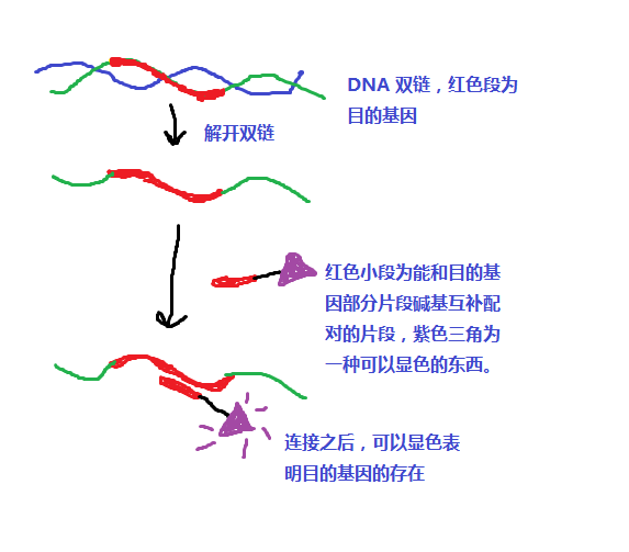 תחת pH, טמפרטורה וחוזק יוני מתאימים, בדיקת ה-DNA יכולה ליצור קשר מימן עם ה-DNA החד-גדילי המשלים או ה-RNA המשלים בדגימה שתיבדק על ידי ניצול הדיוק הגבוה של דנטורציה מולקולרית, חידוש וזיווג בסיס משלים. לשלב ליצירת קומפלקס דו-גדילי.